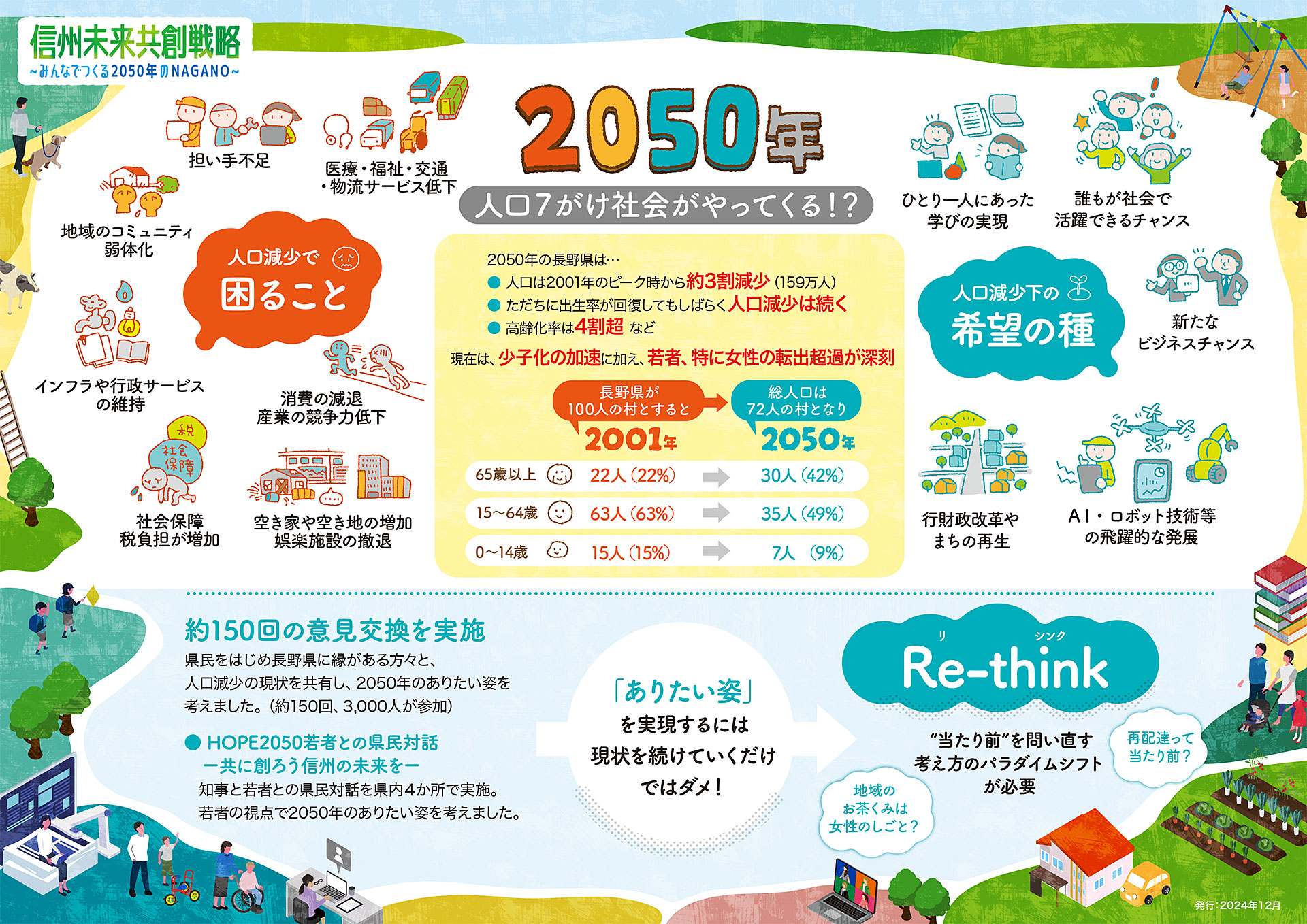 人口減少を単なる衰退と捉えるのではなく、社会全体の構造を変えることで、持続可能で希望あふれる信州を共に創り上げていくための指針です。