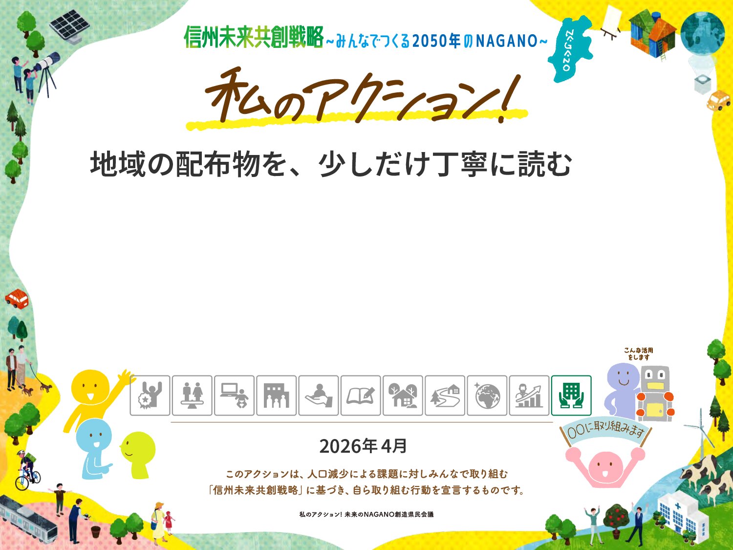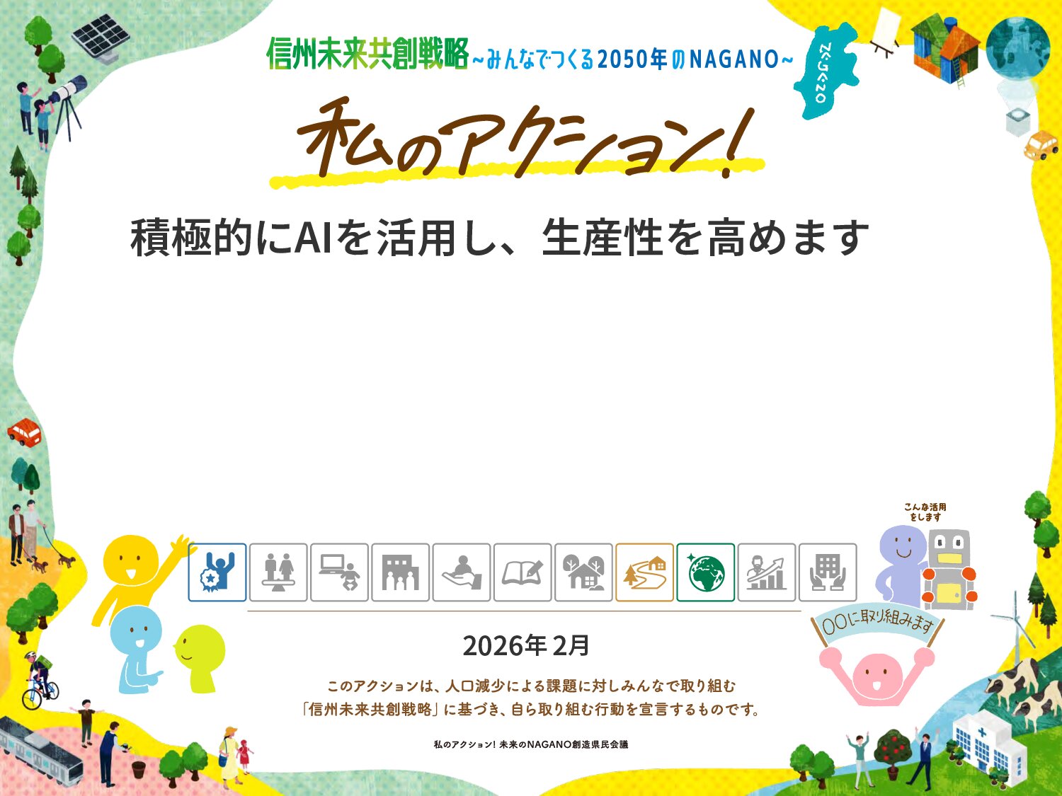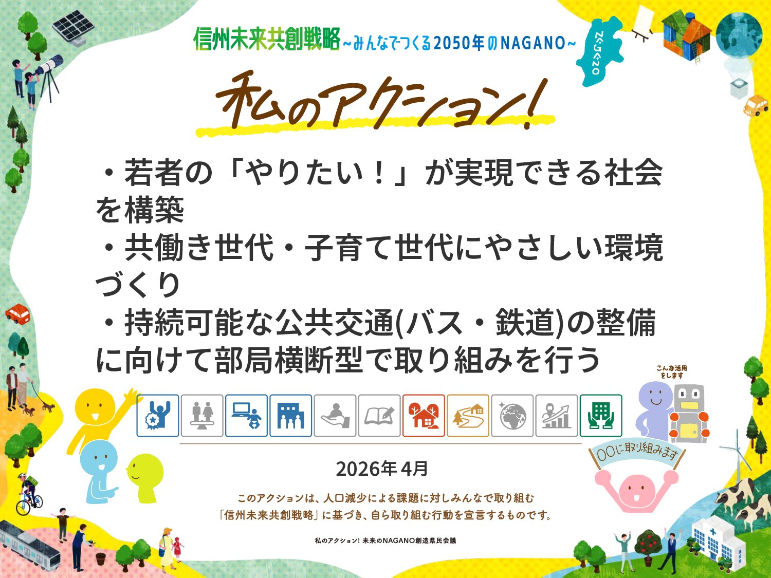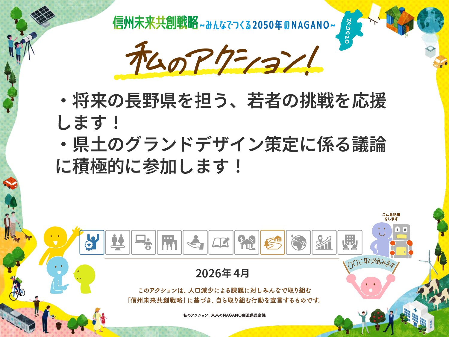 「私のアクション!」は、明るい未来の実現に向けた取組の方向性に沿って、県民や県内の企業・団体が自ら考え取り組む行動です。