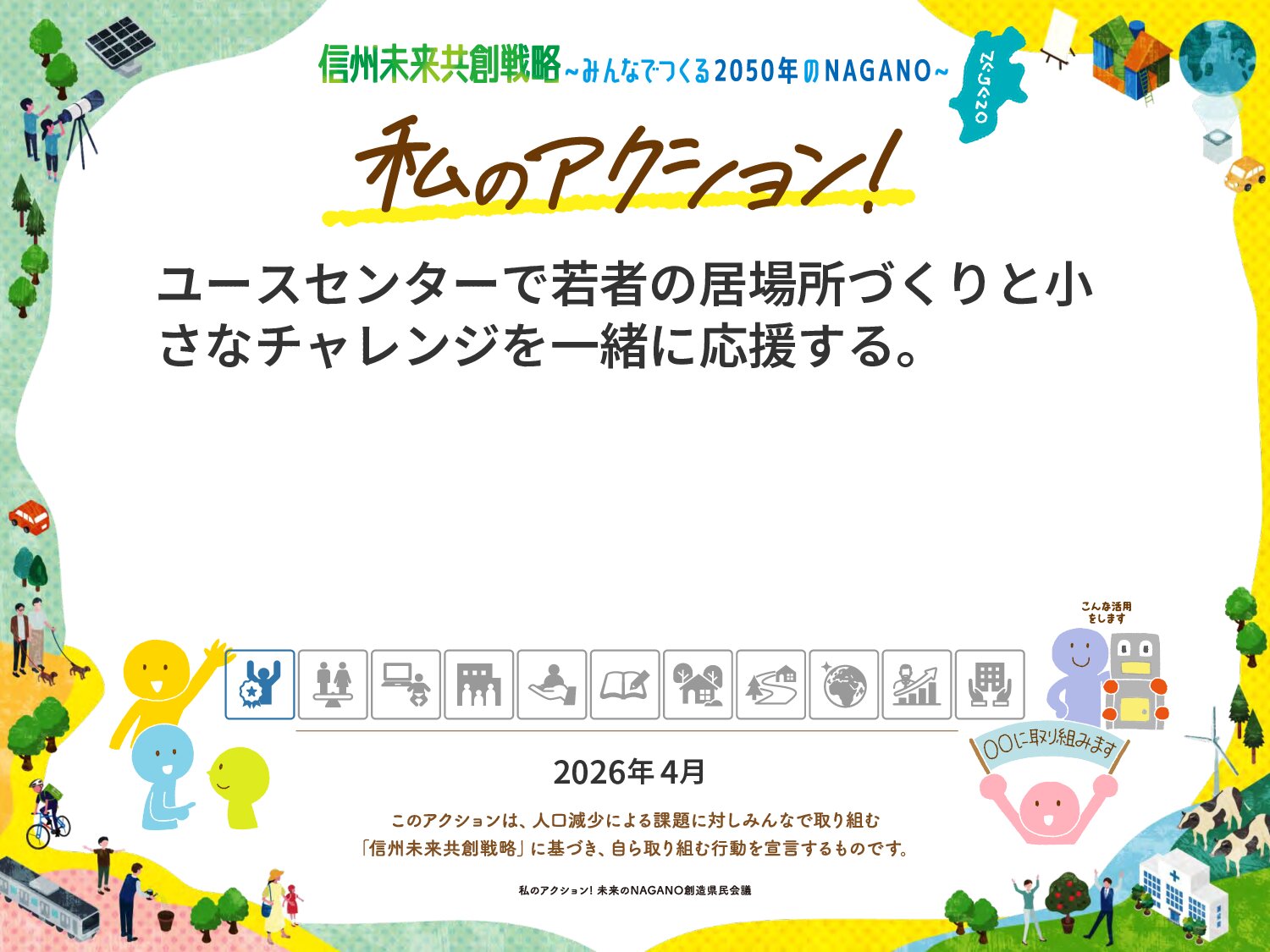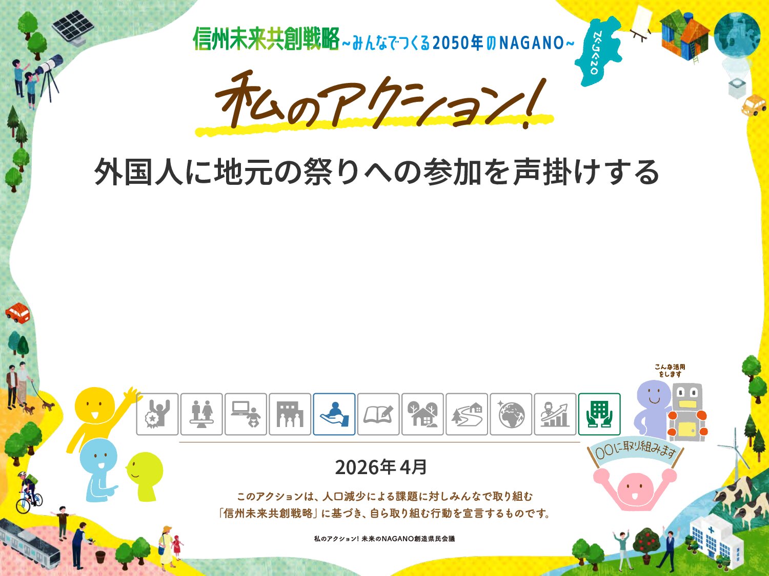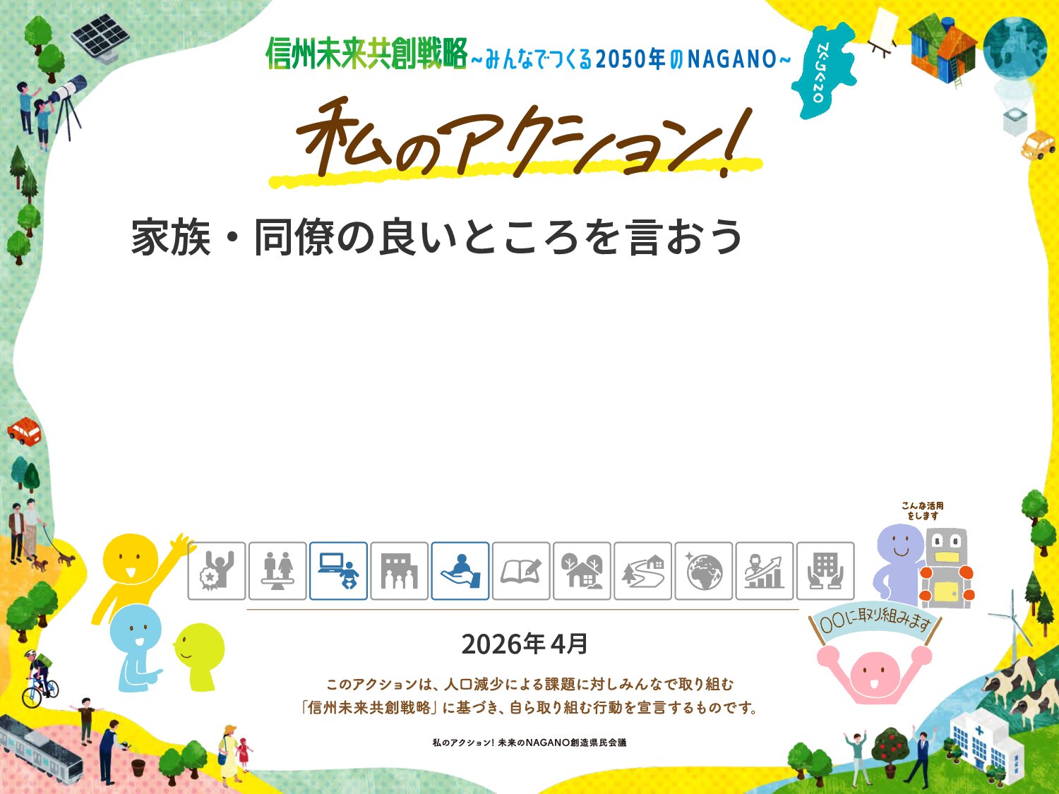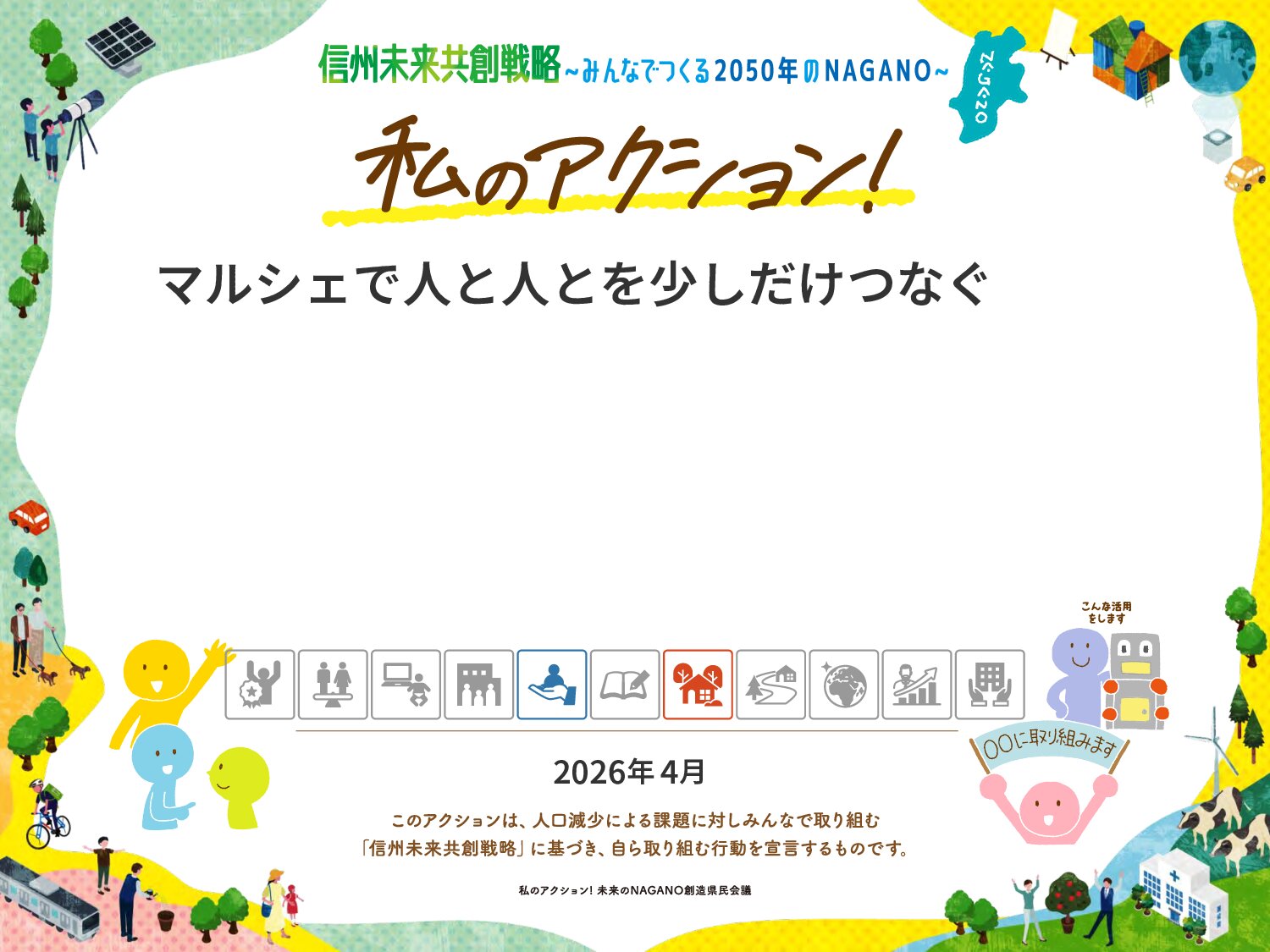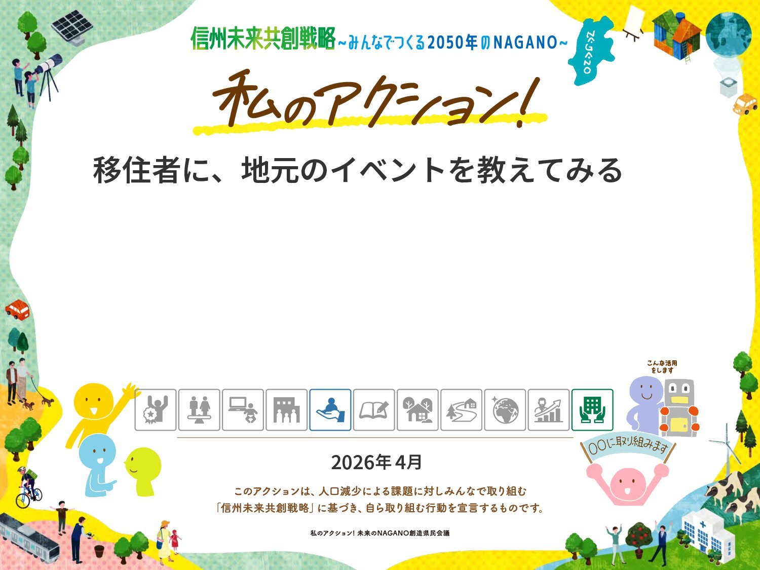 「私のアクション!」は、明るい未来の実現に向けた取組の方向性に沿って、県民や県内の企業・団体が自ら考え取り組む行動です。