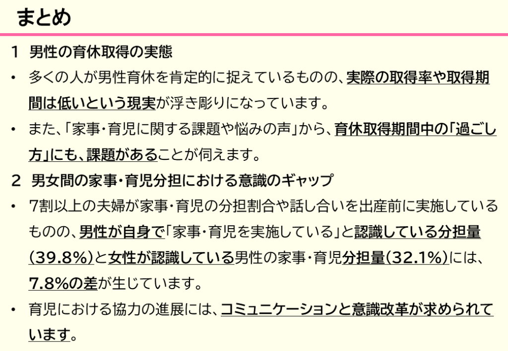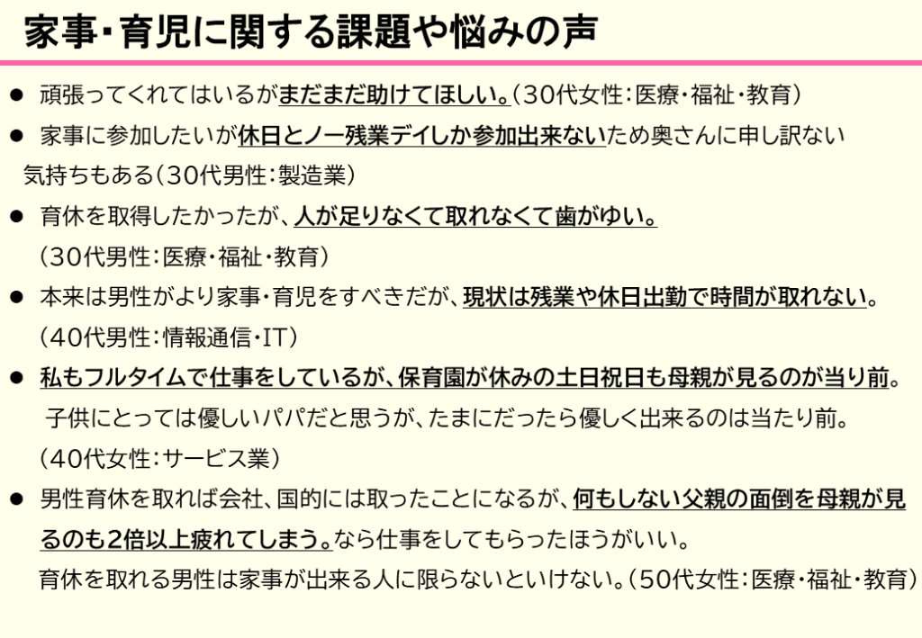 家事・育児の参加状況や、夫婦間の家事・育児分担の満足度ギャップなど、貴重なデータが集まりました。