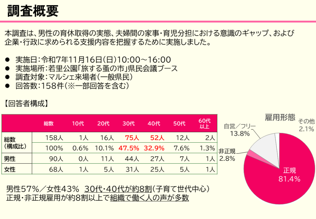 それぞれの取組や育児で直面した課題を話し合う中で、子育て世代のリアルな声や思いを聞きたい」といったアイデアが生まれ、プレパパ・プレママや子育て中のお父さん、お母さん等を対象にアンケートを実施しました。